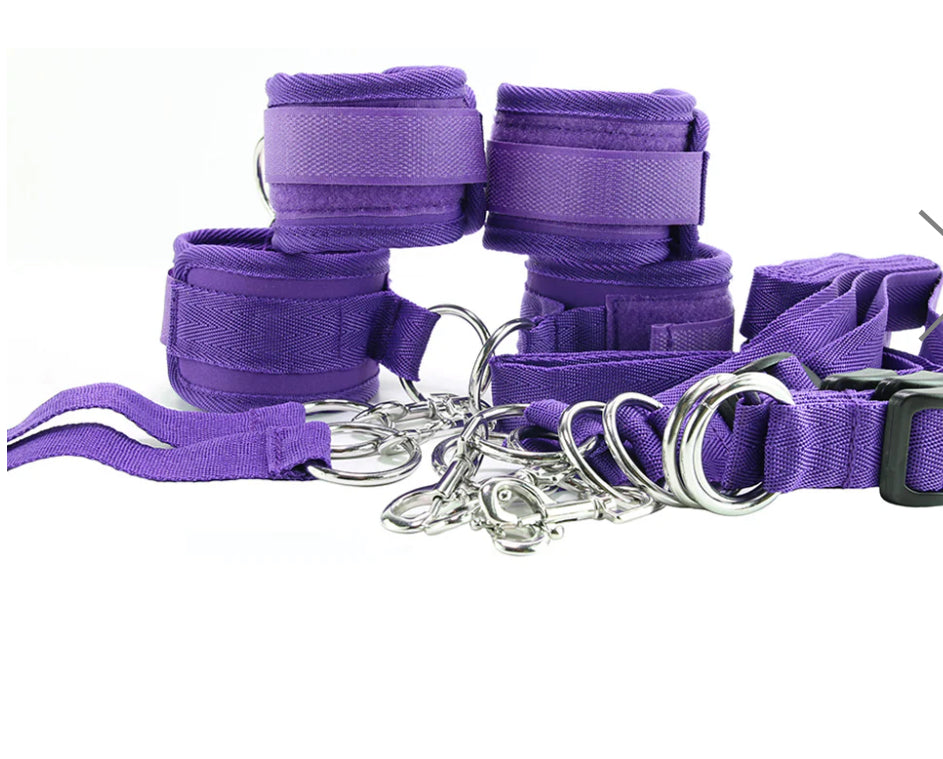 As fun as super-adventurous out-in-public, hotel room or other sneaky sex shenanigans can be, sometimes, there's just nothing like your own bed for down n' dirty doings. Helping turn your comfy haven of sleep and sex into a kink-ready playground of bound-up potential is Lux Fetish's 7 Piece Bed Spreader Restraint System in pretty purple.