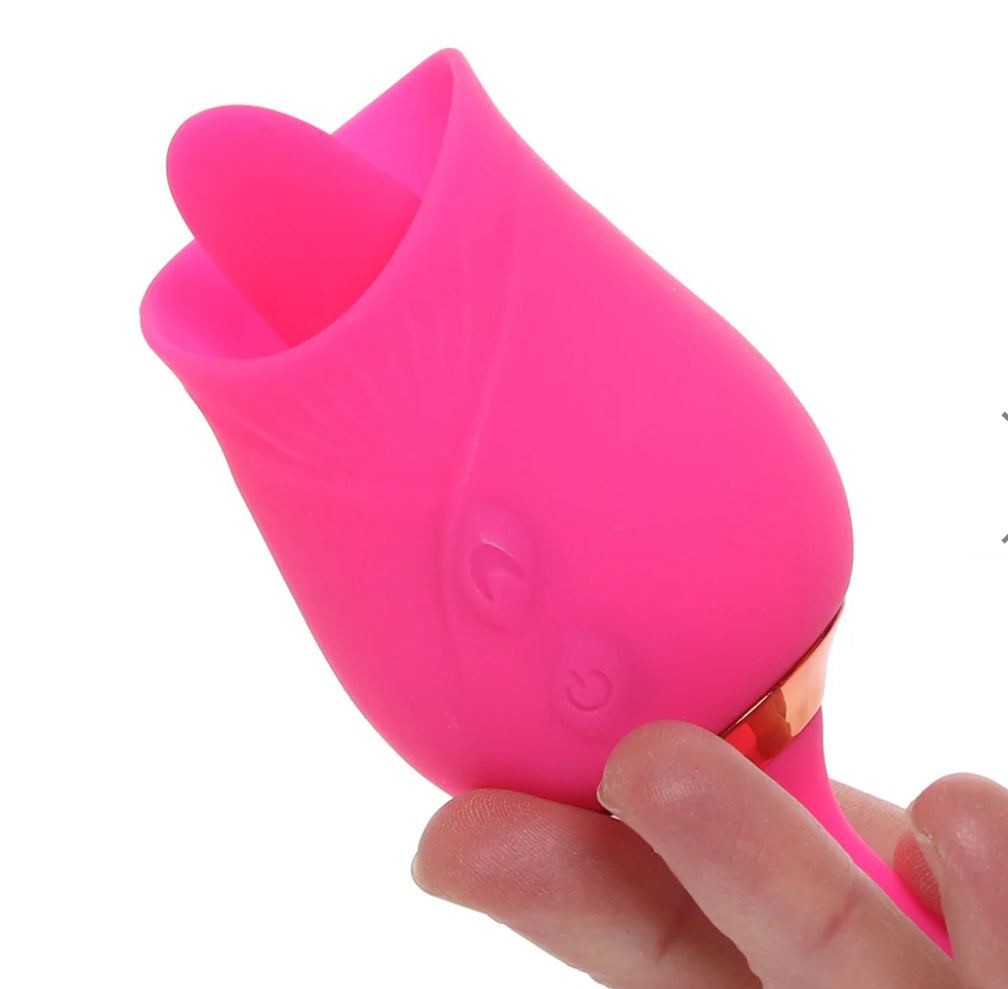 Separate buttons on the rounded rose control ten licking tongue modes and ten more thrusting bullet options.